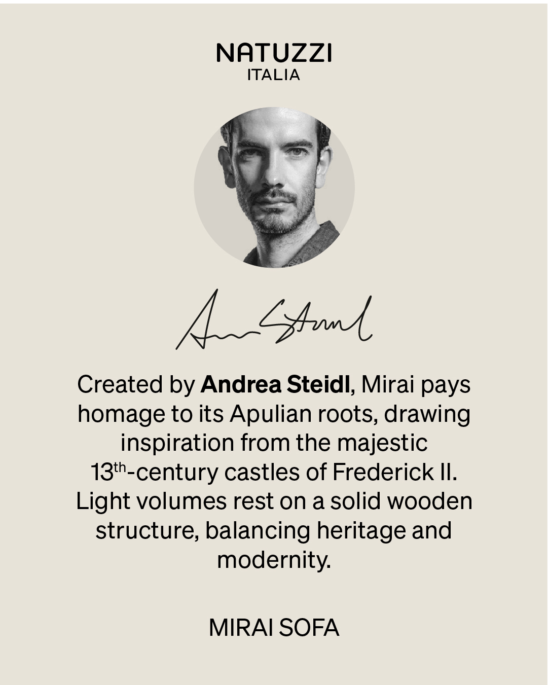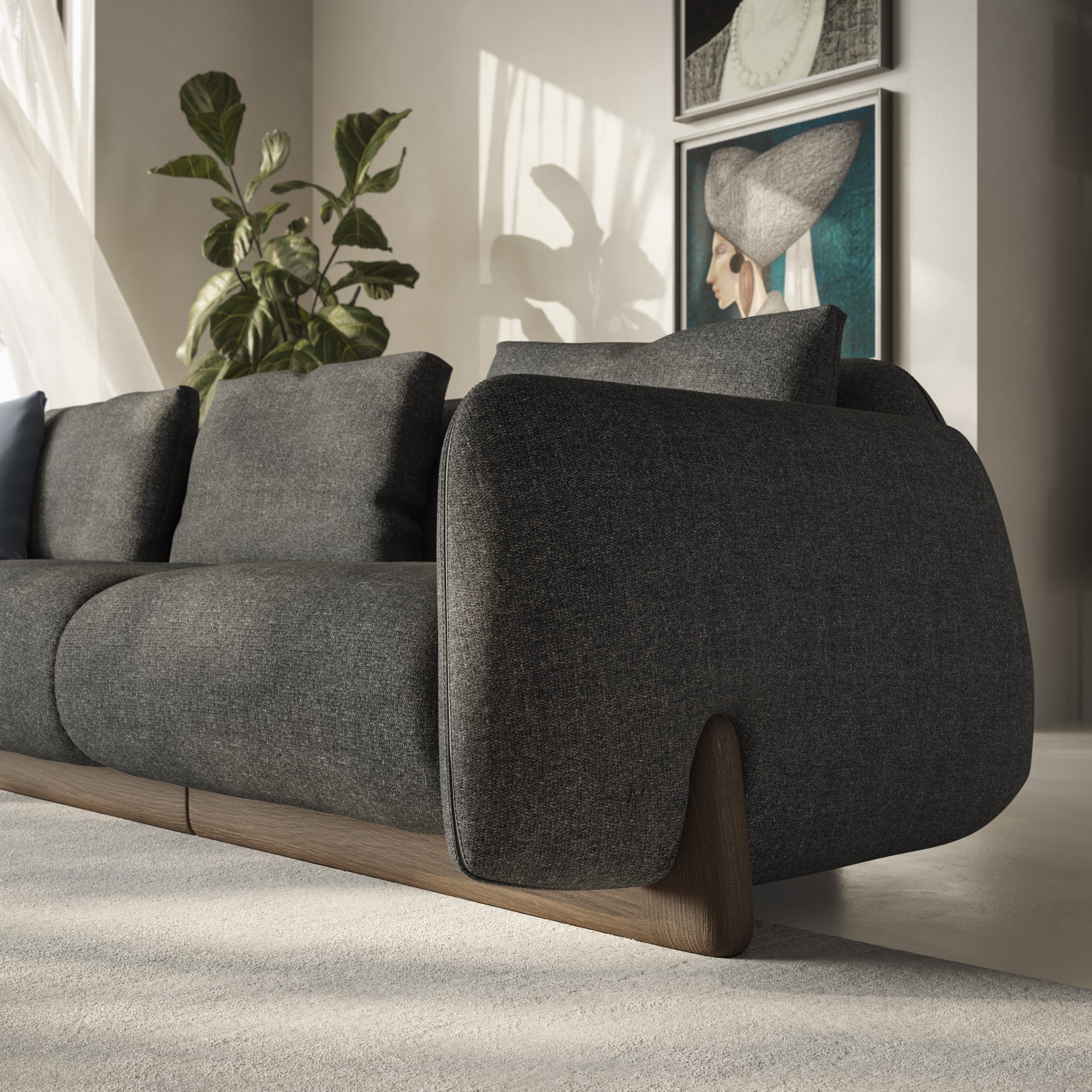Čvrsta baza izrađena je od masivnog drveta dostupna u dvije luksuzne završne obrade: orah i sofisticirani dimljeni hrast. Dizajnirana sofa za eleganciju i izdržljivost ovaj pomno izrađen komad dodaje dašak bezvremenskog šarma svakoj prostoriji. Mirai ima potpuno tapecirane stranice, poliuretansku pjenu visoke gustoće na sjedalima, a jastuci na naslonu punjeni su perjem.