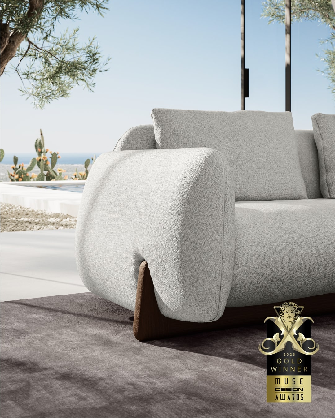Kroz pametnu optičku iluziju, linije kauča slične dvorcu, naizgled se razilaze prije nego spajaju s ponavljajućim elementima stvarajući maštovitu, pokretnu teksturu. U ovoj profinjenoj garnituri elementi se spajaju drvnom konstrukcijom koja podržava mekane volumene. Tri su osnovna elementa kauča: jastuk, naslon i naslon za ruke – razigrano variraju u visini povećavajući vizualnu udobnost.